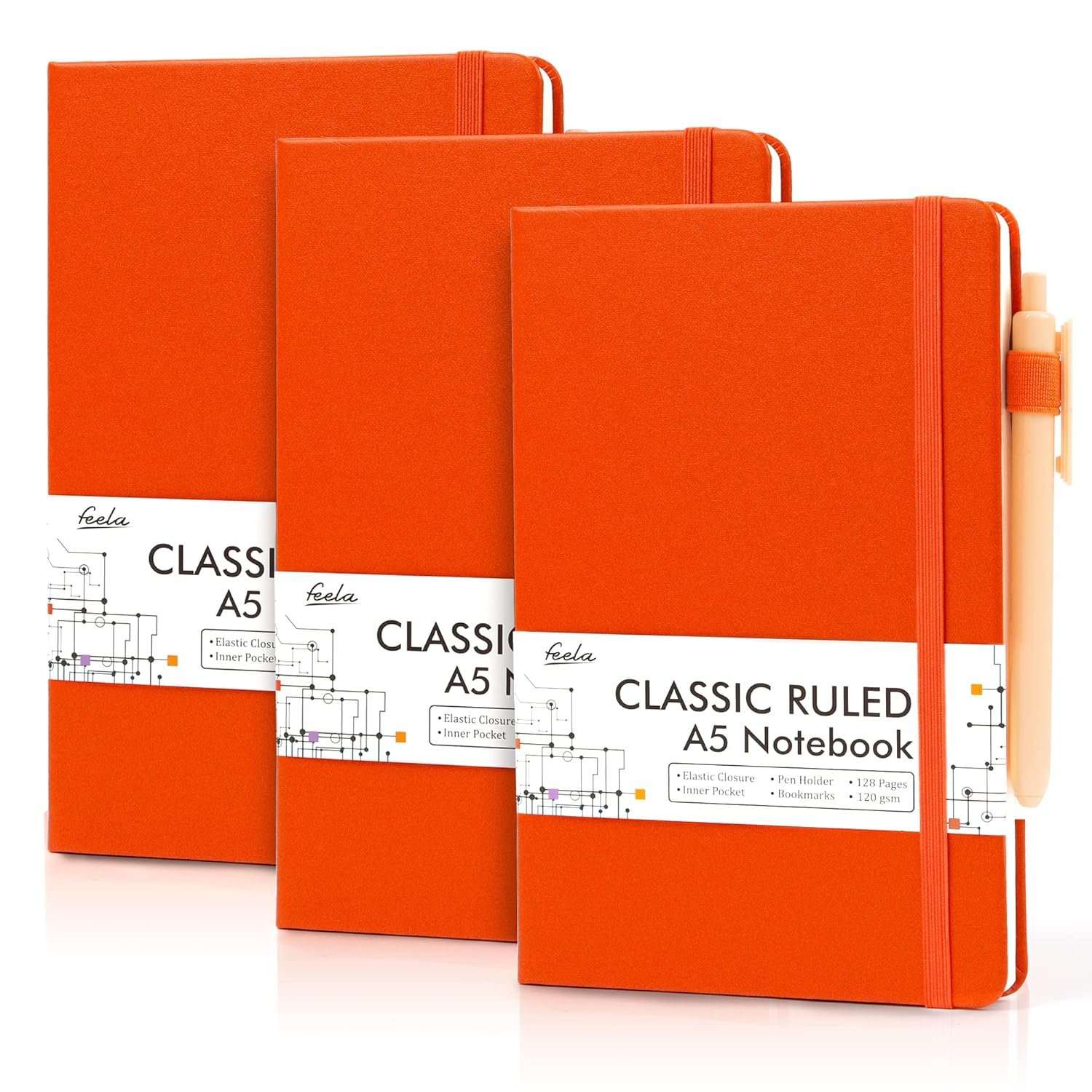 3 Pack Notebooks Journals Bulk with 3 Black Pens, Feela A5 Hardcover Notebook Classic Ruled Lined Journal Set with Pen Holder for Work Business Journaling Note Taking, 120 GSM, 5.1”x8.3”, Orange