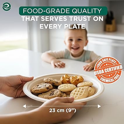 - Eco-Friendly Elegance: These disposable plates big size have no plastic or trees. Made from upcycled sugarcane bagasse, these eco-friendly plates, in 23 cm * 23 cm size, are here for a planet-safe lifestyle. They are a good choice for evening snacks or casual home parties, without worrying about creating excessive waste.